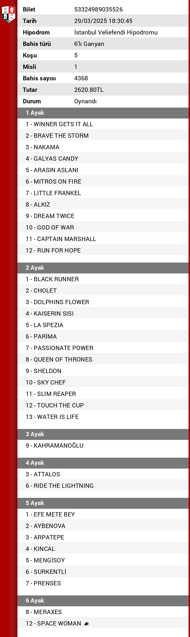 Bahis sayısı 96 Tutar 72,00 ₺