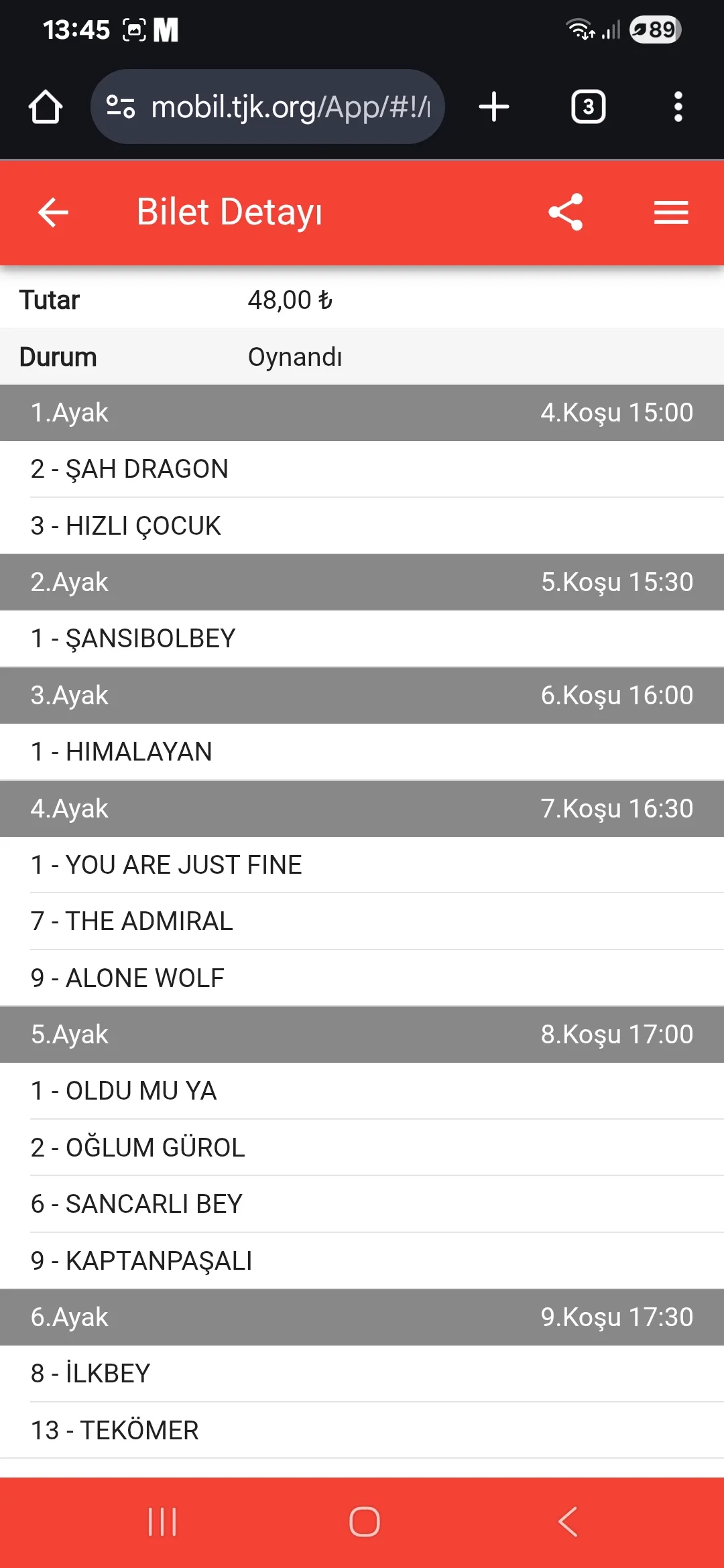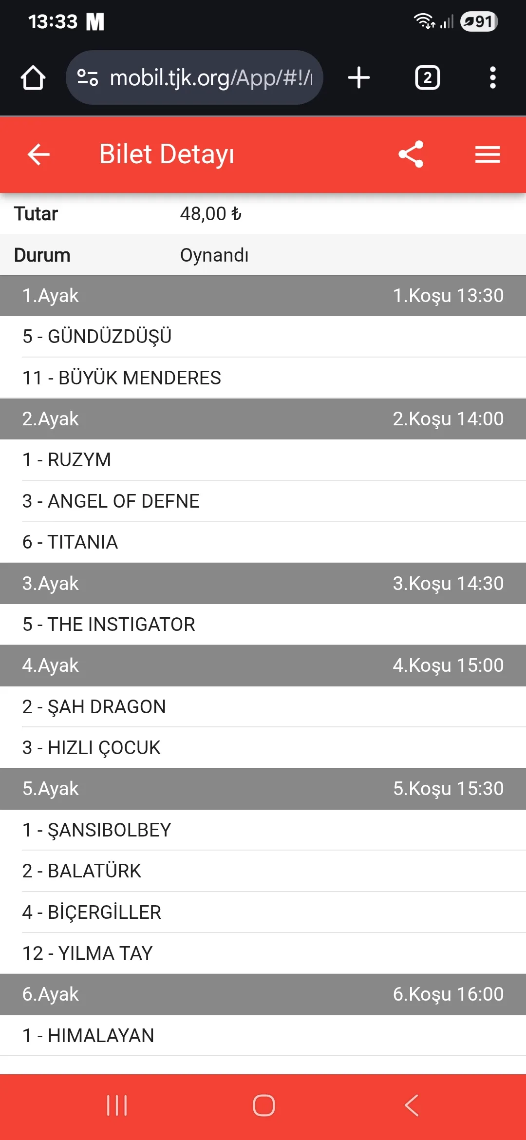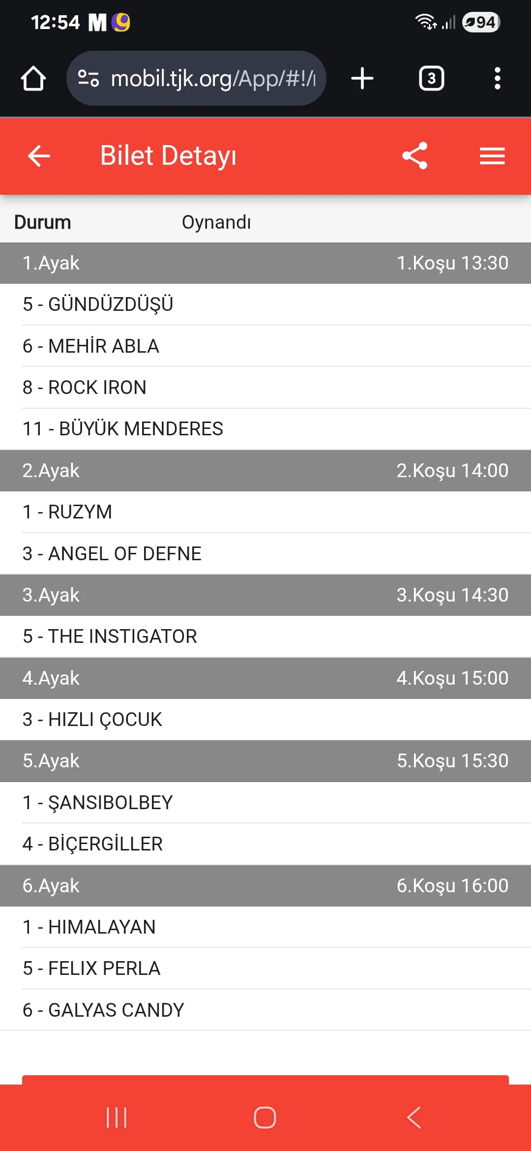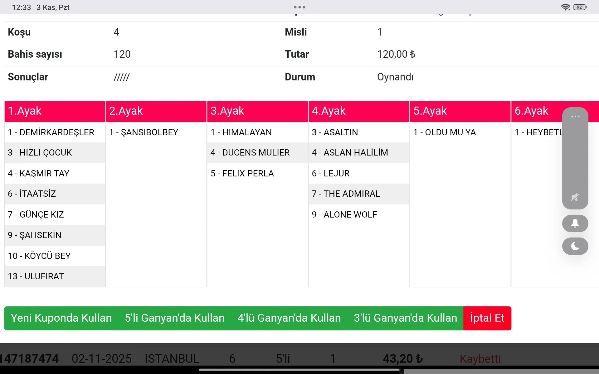 t no 92001194831943 Bahis türü 6’lı Ganyan