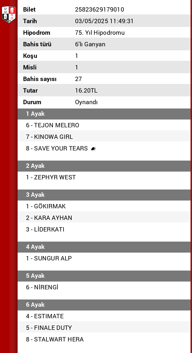Bilet no 87334036343925 Bahis türü 6’lı Ganyan