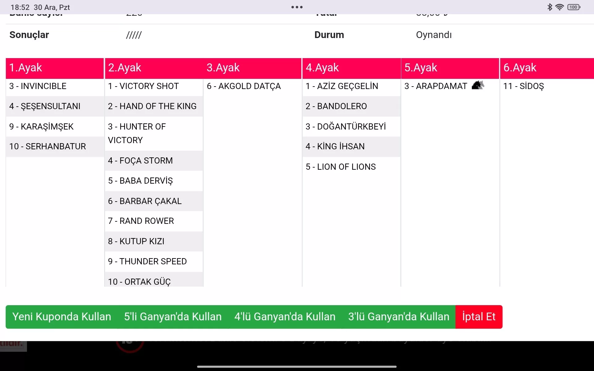 5.AYAK : 3 ARAPDAMAT ekürisi ile birlikte kazanması lazım . BANKO