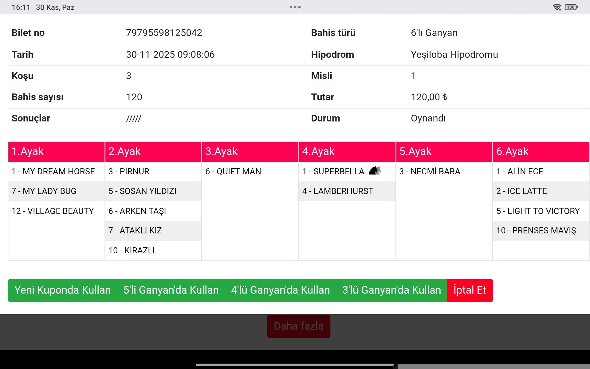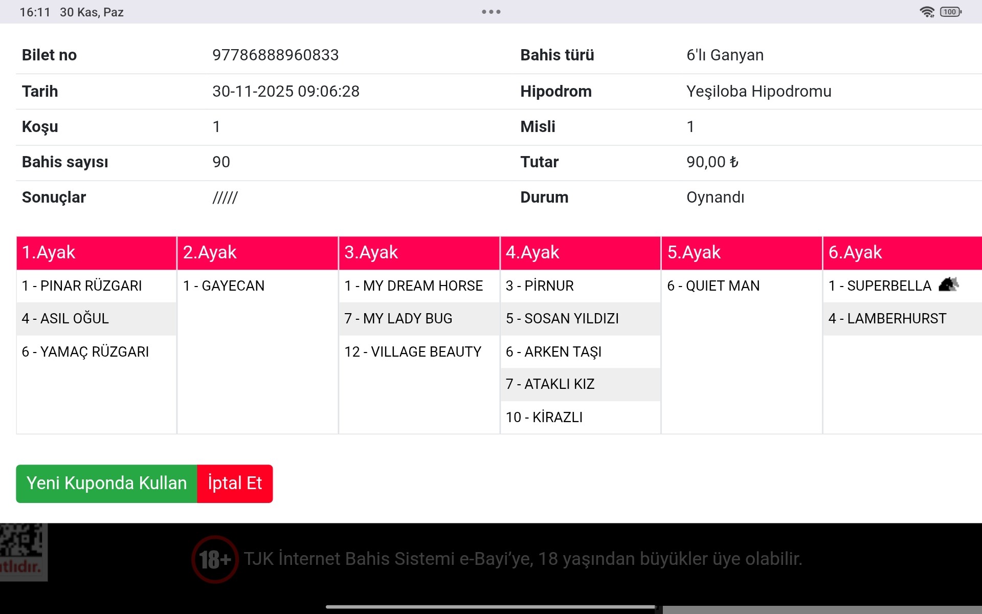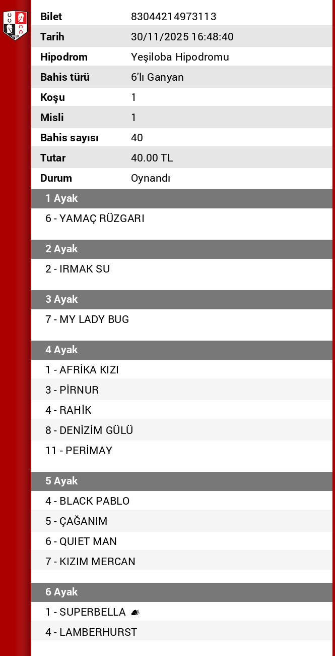 6.KOŞU : 1 SUPERBELLA ALTERNATIF BANKO AMA KV 8 oldugu ıcın 4 LAMBERHURST ve 6 LUPELYAN yazmakta fayda var parayı burası verdirecek