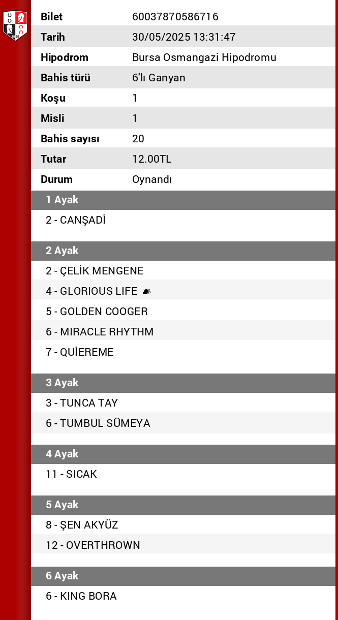 Bilet no 45799082515617 Bahis türü 6’lı Ganyan
