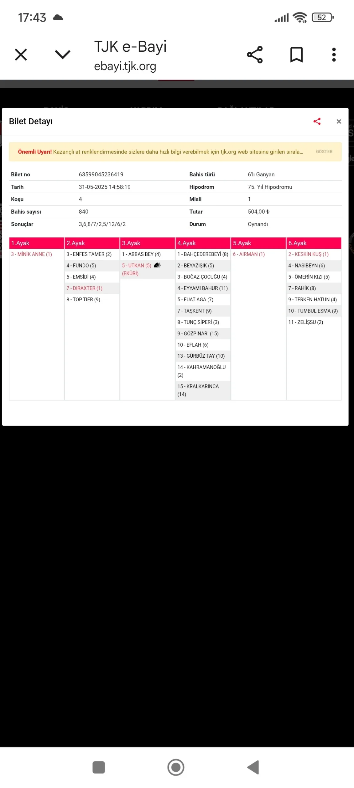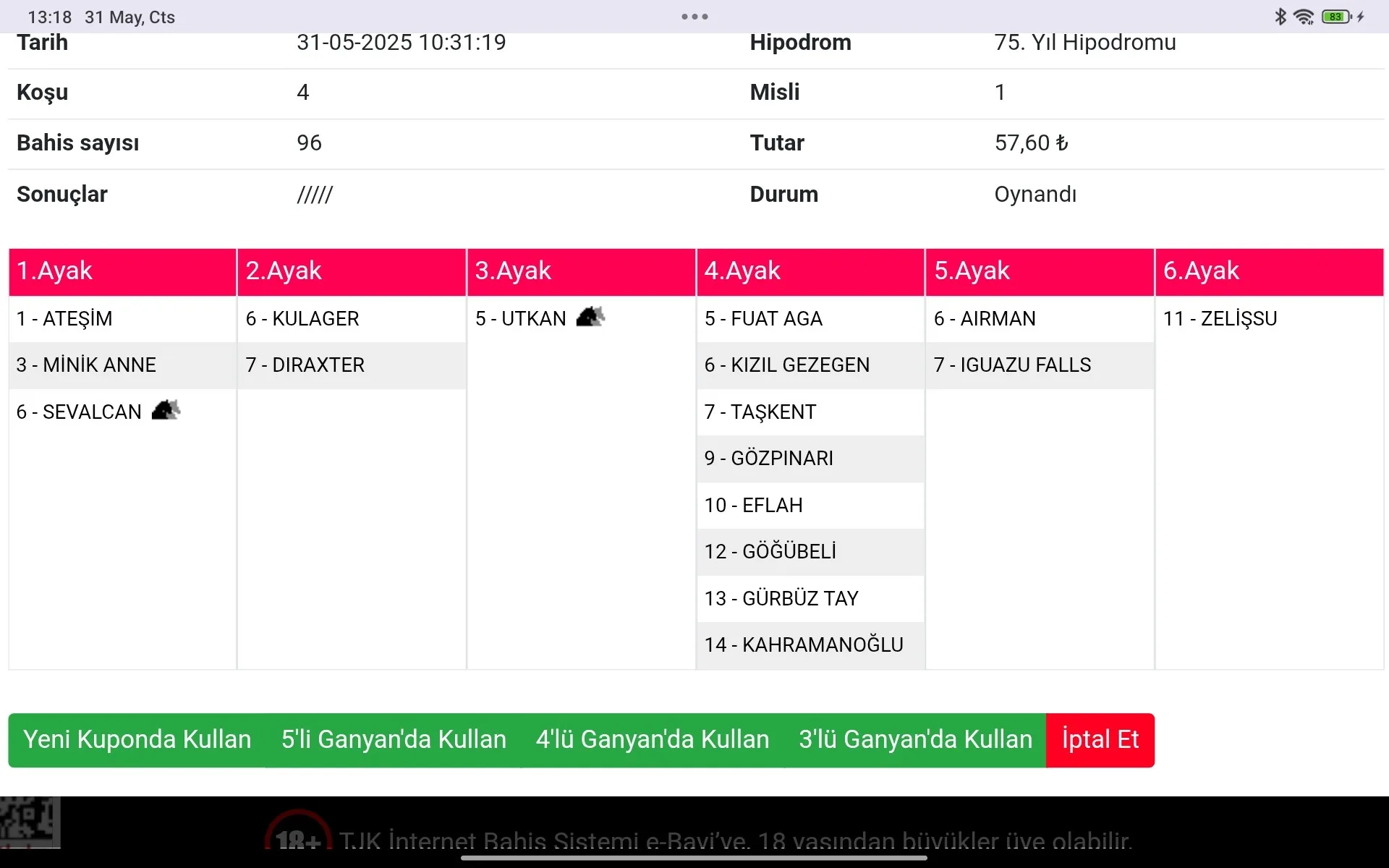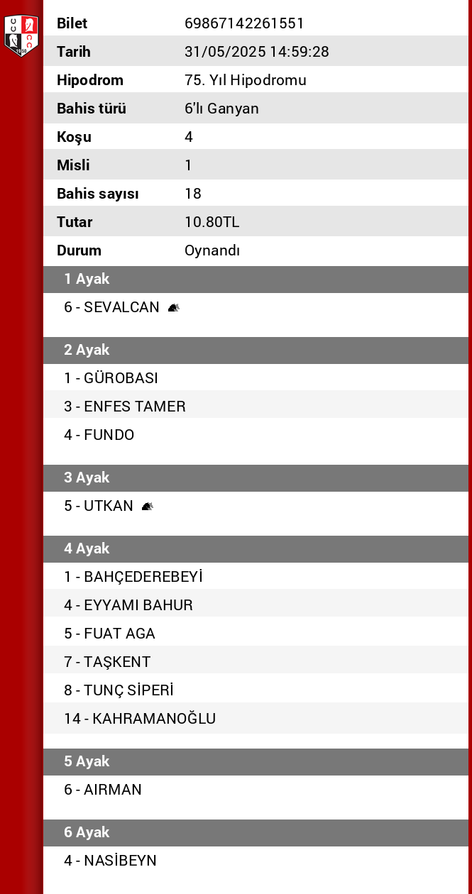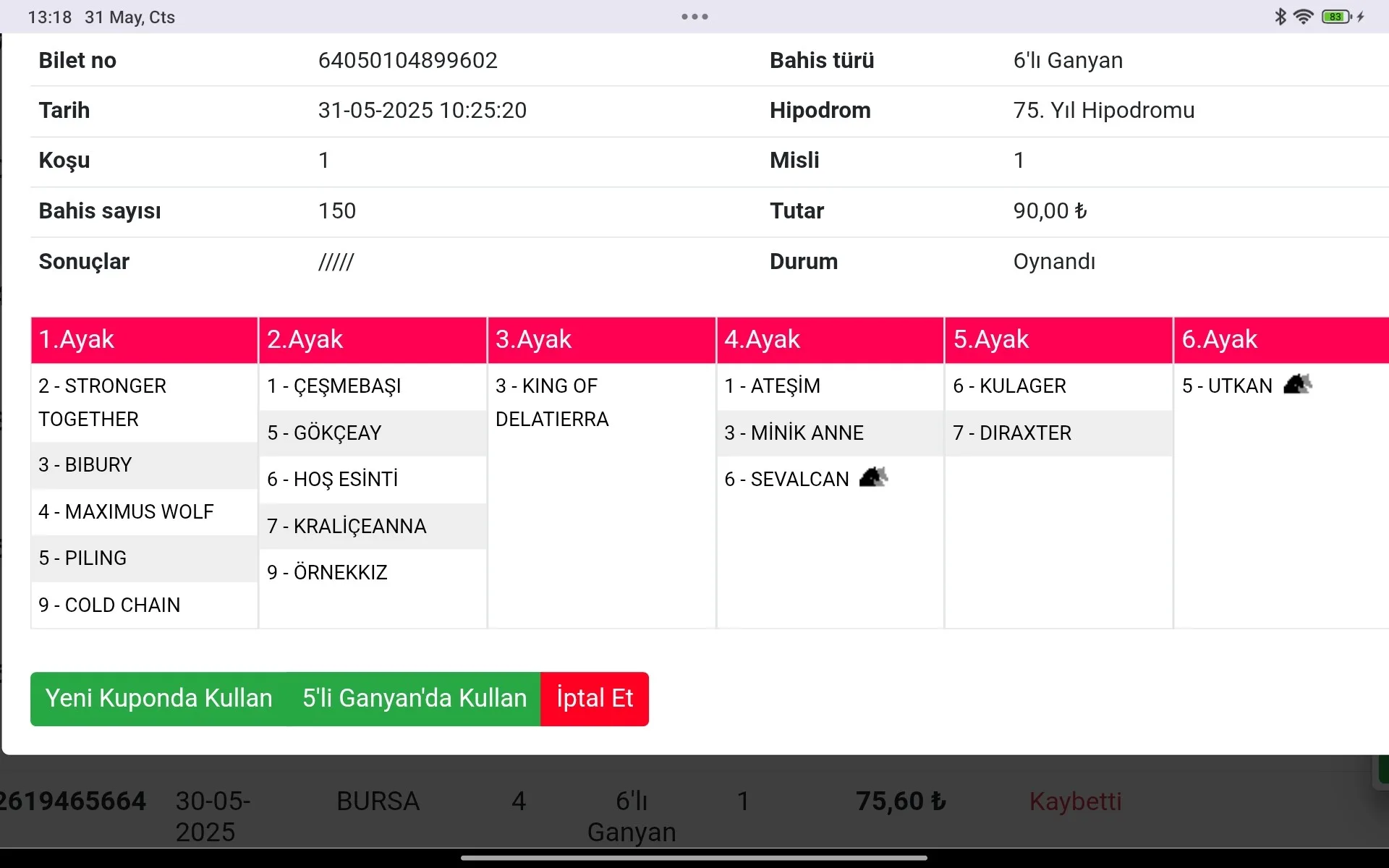 Bilet no 55853885813293 Bahis türü 6’lı Ganyan