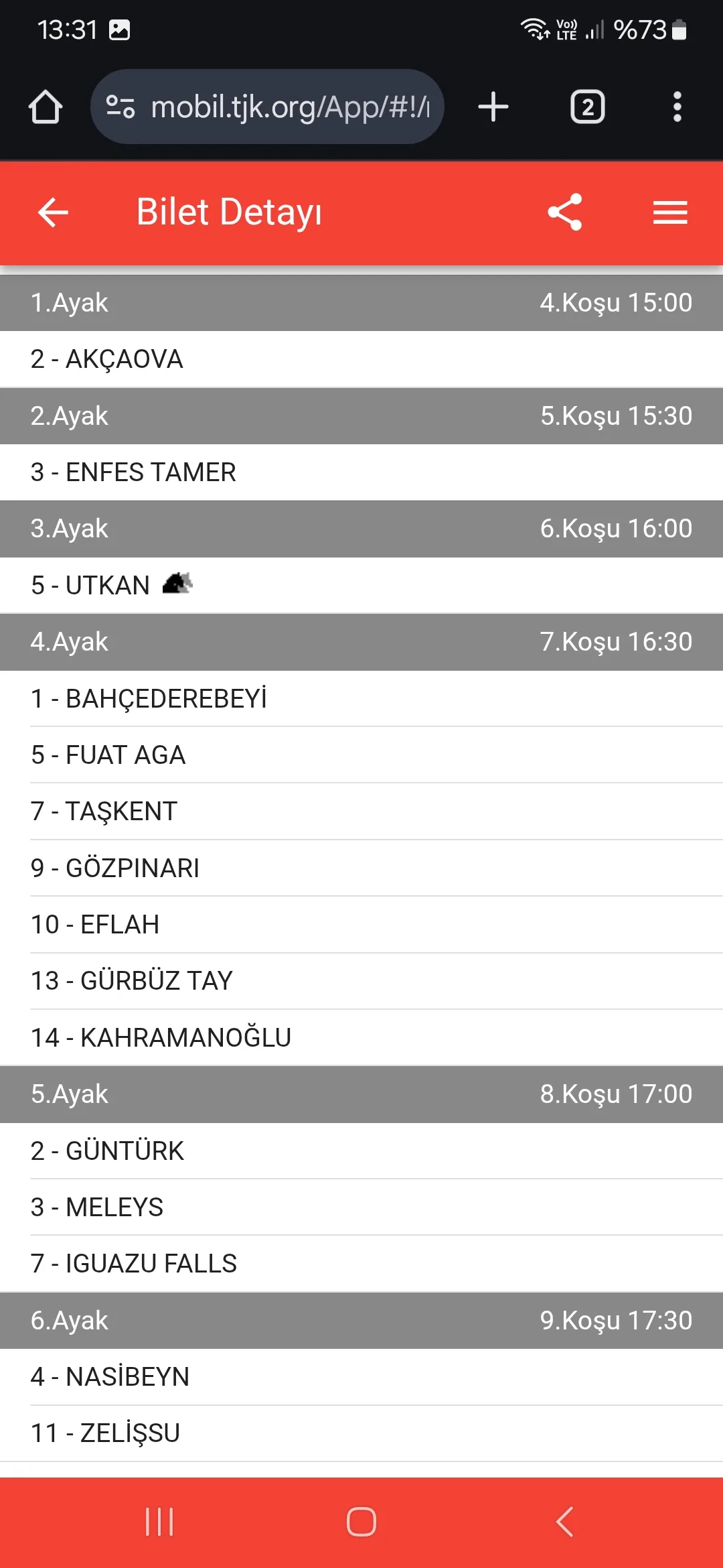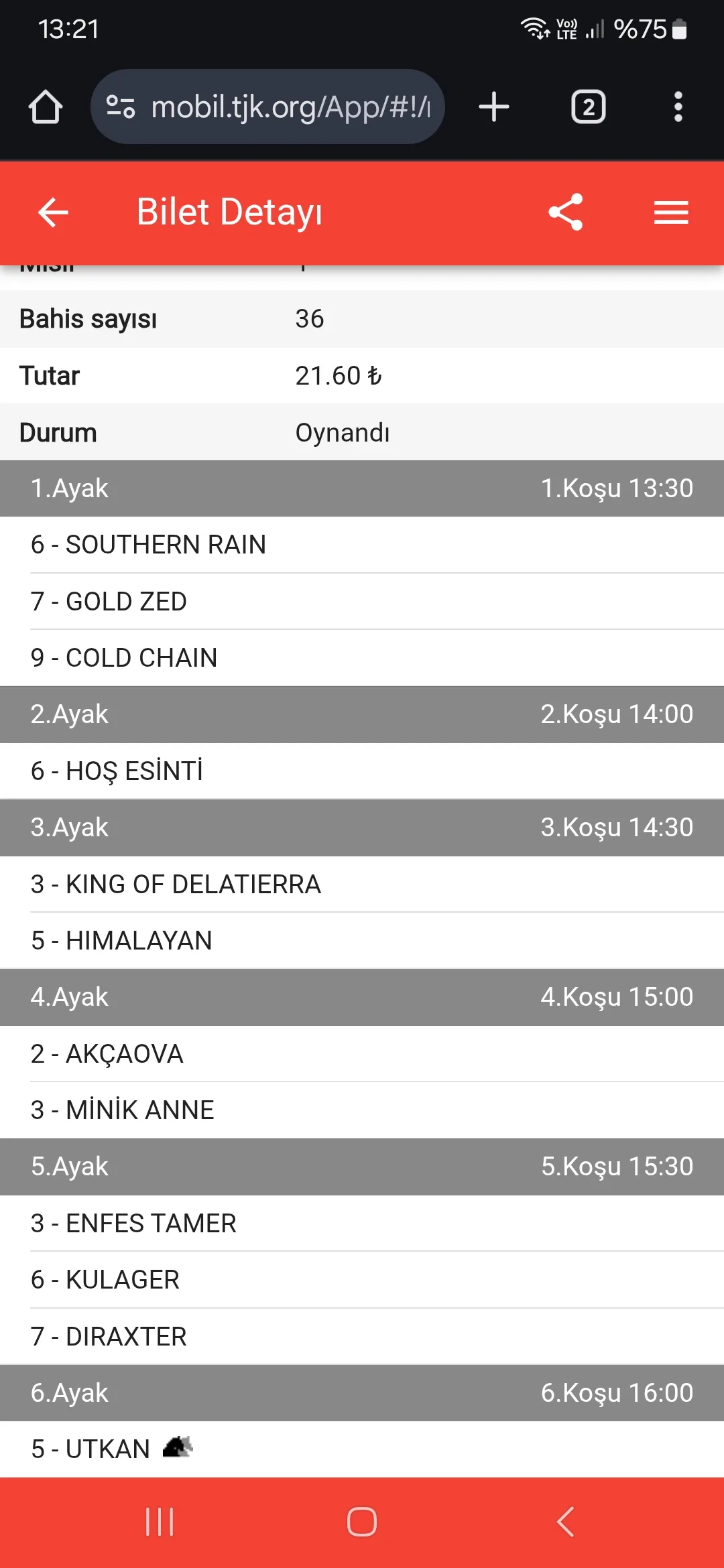 Bilet no 21748124326110 Bahis türü 6’lı Ganyan