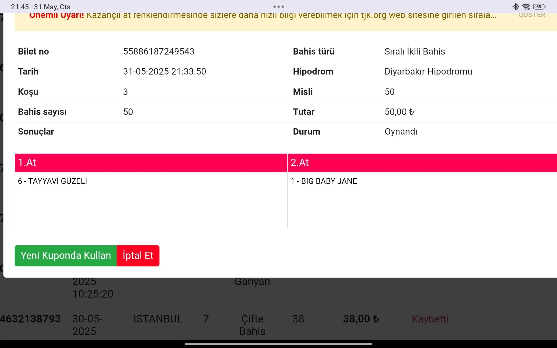 Bilet no 60562278262205 Bahis türü Sıralı İkili Bahis