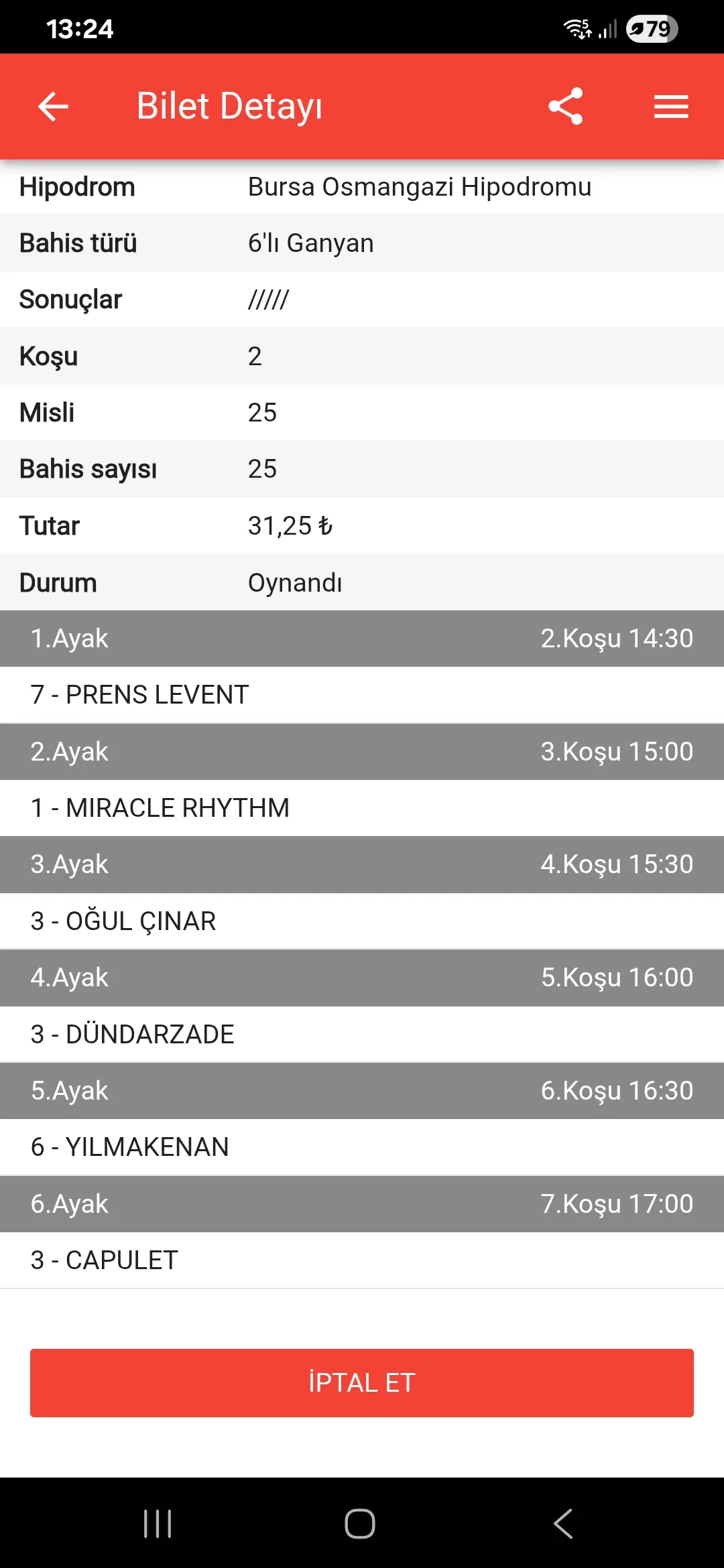 Bugün altılı Bursa’da 1.25 TL oran ile çarpılacaktır. Herkese bol şanslar.