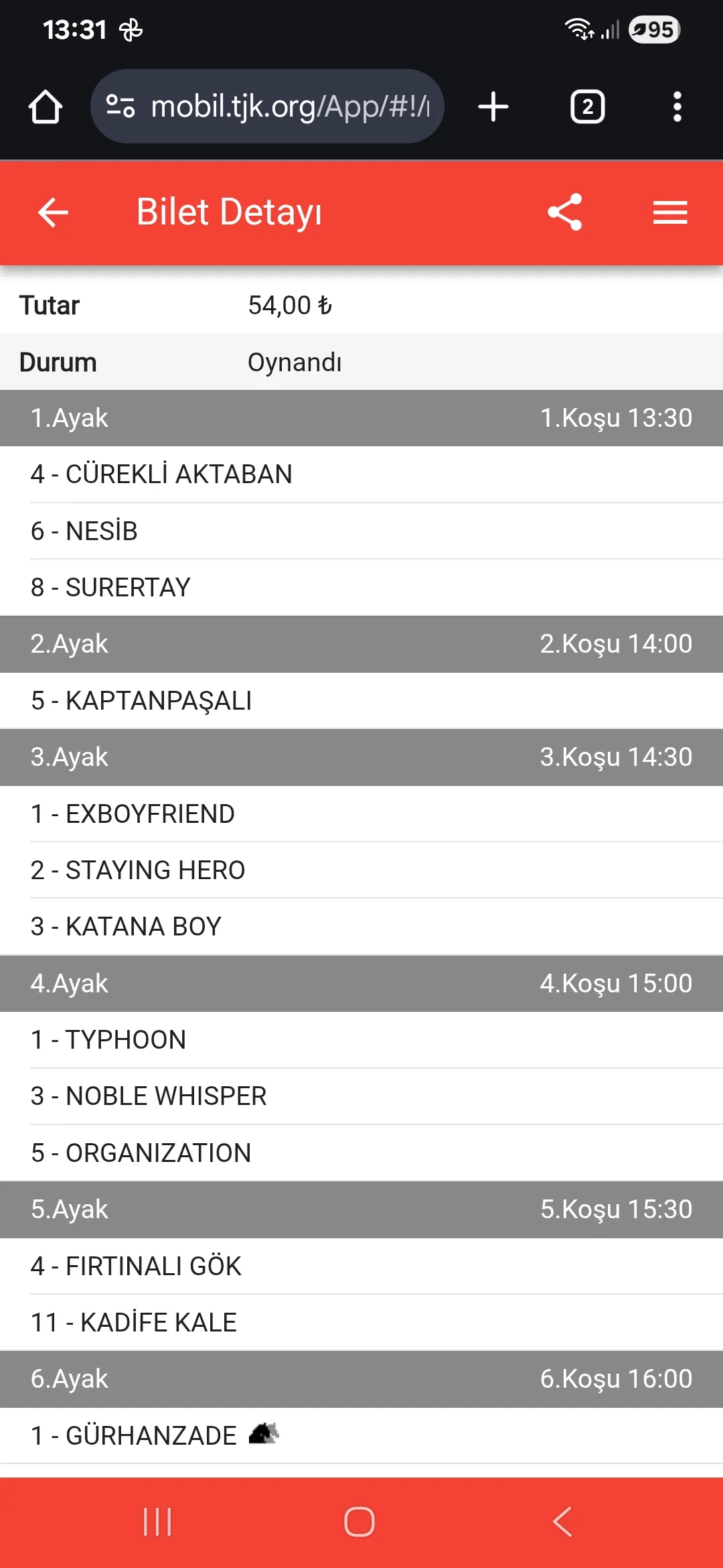 Bilet no 24442703938414 Bahis türü 6’lı Ganyan