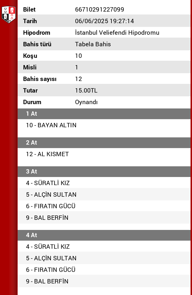 10.KOSU))) cok cok acik farkla favorim 5 ALCIN SULTAN.ayagi yeterince güclenmistir .bu hafif pistte ucabilir.iyi bir tempo koyup rakipleri uyutabilir.tek sikinti yarista 9 BALBERFIN in olmasi.eger BALBERFIN rahat tempo yaparsa bu sefer o cok tehlikeli olur. .8 JALELA bu sefer yerinde yürürse etkili sprintiyle kazanan da olabilir.kaldiki burada yaristan kopan cok olacak.yol sorunuda yasamaz bu sayede. Bir yaris görüp nefes acan bu grubun en kalitelisi 10 BAYAN ALTIN mutlaka sansli olur.6 FIRATINGÜCÜ,1 SABIKATAY ve 14 AHUUATA sürprize calisacak.
