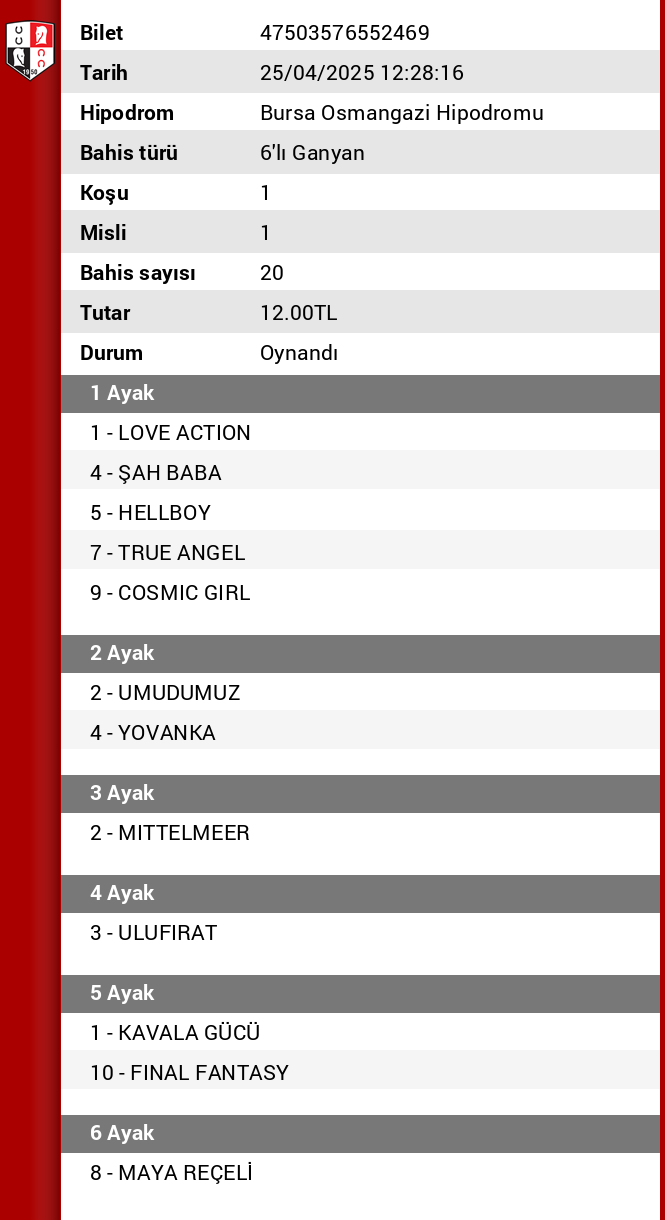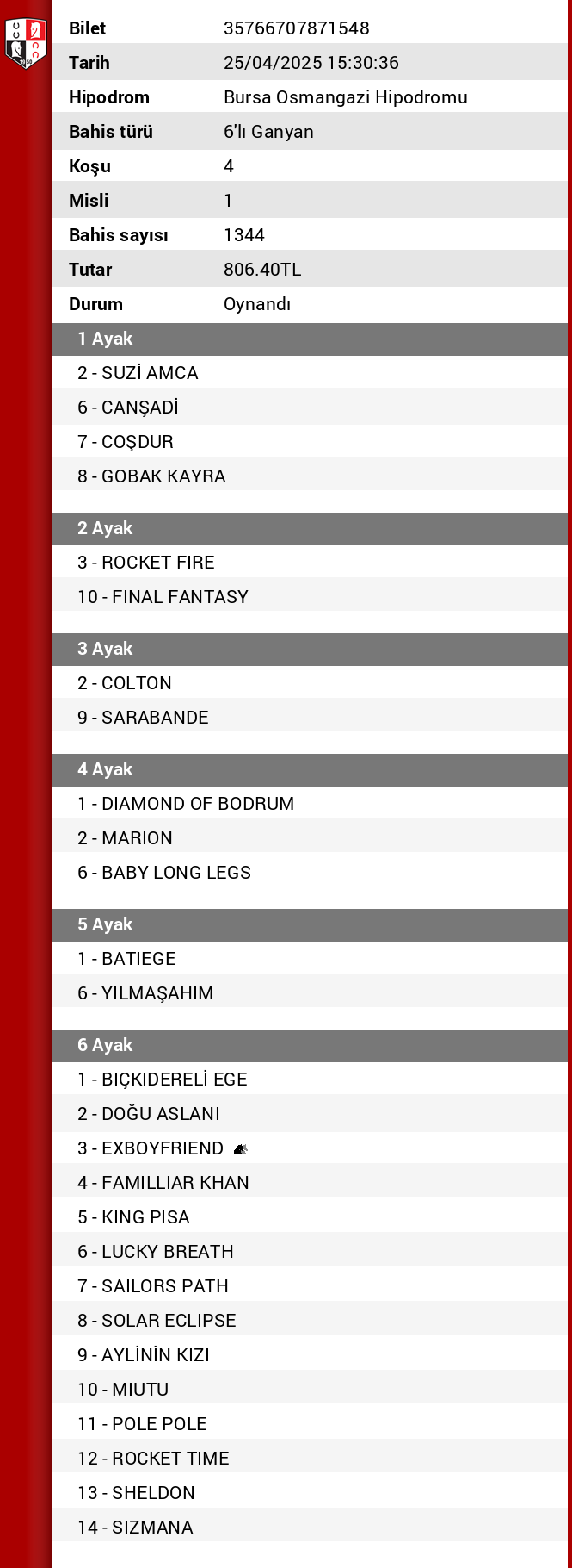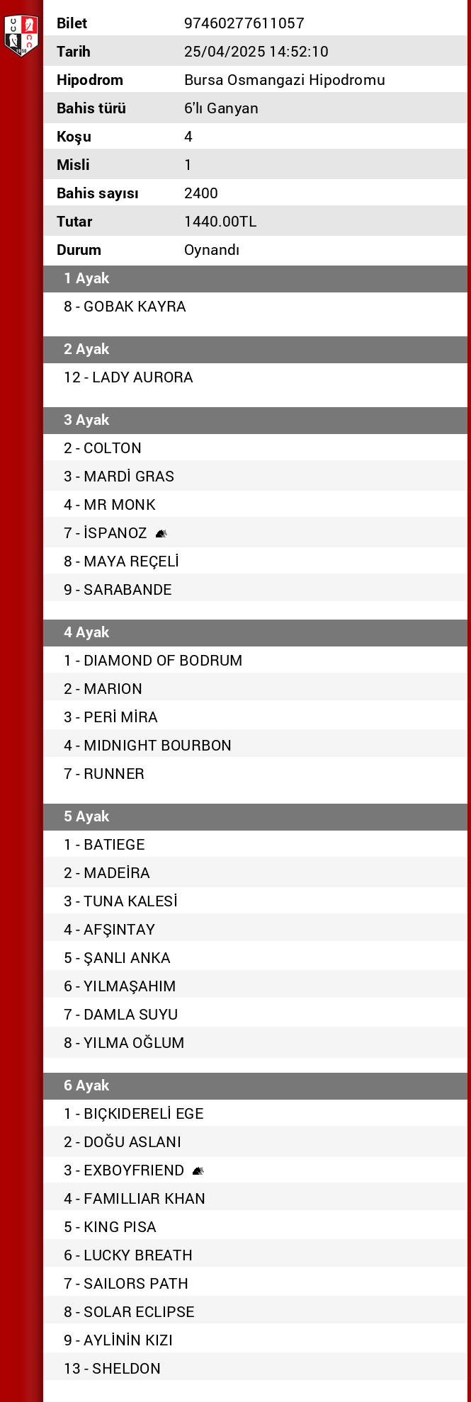 Bilet no 22477533387962 Bahis türü 6’lı Ganyan