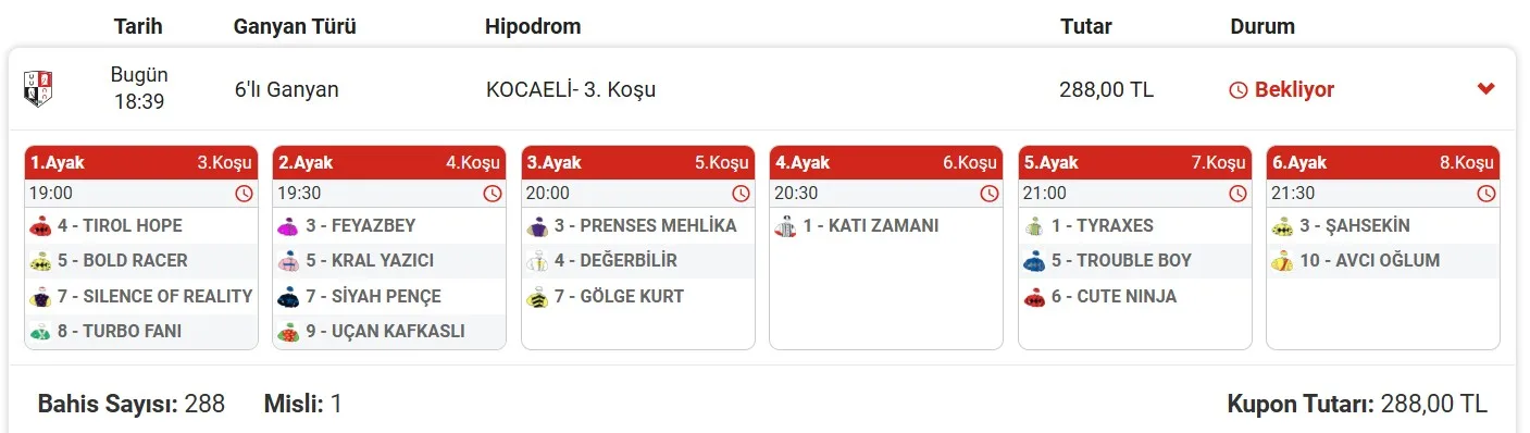 6.KOŞU: Son yarışını 65 kg ile kazanan ve bugün de 66 kg ile % 80 üzeri AGF ile koşacak olan KATI ZAMANI‘nın bu rakipleri yanında yine kazanmasını bekliyorum, BANKOM…