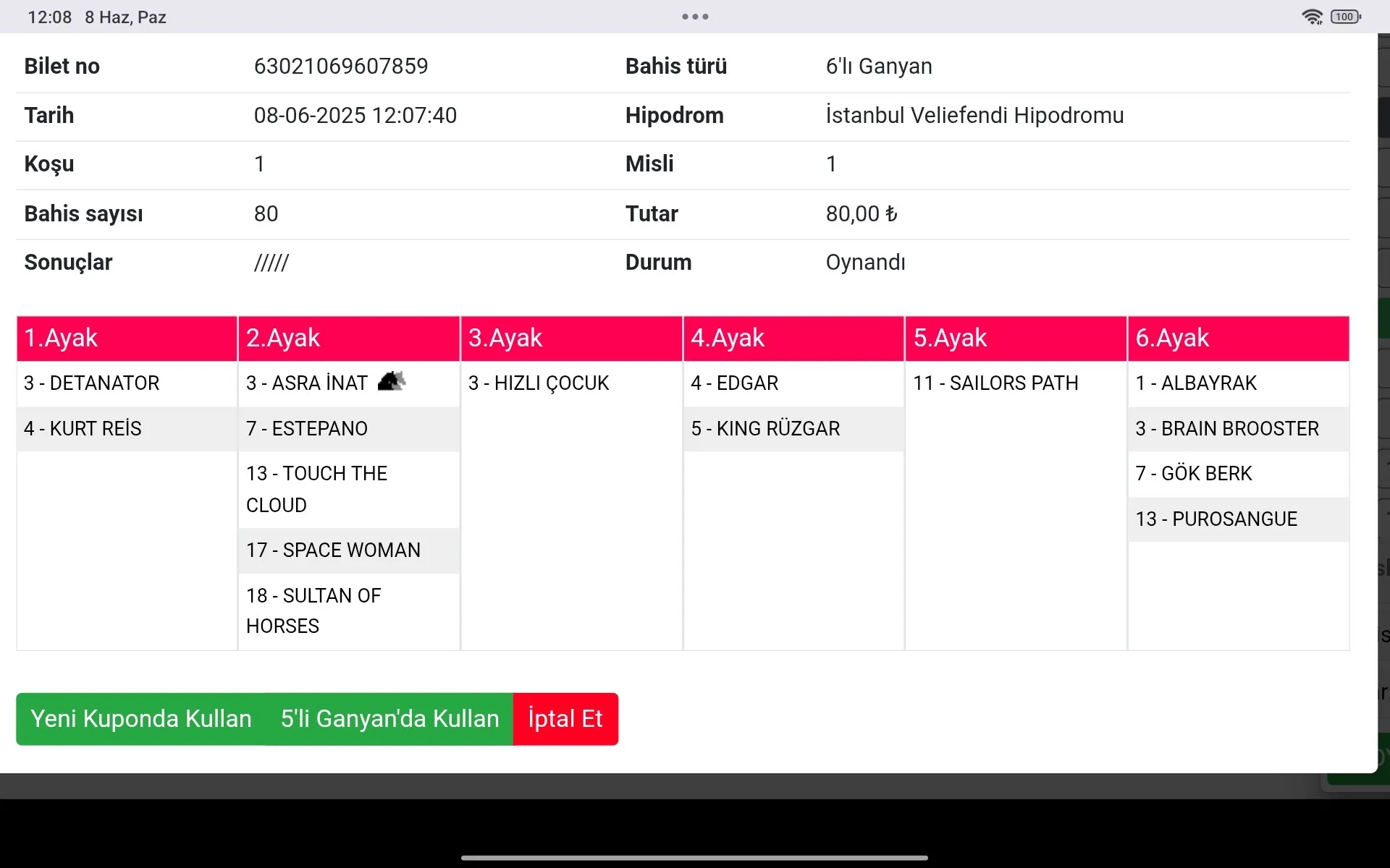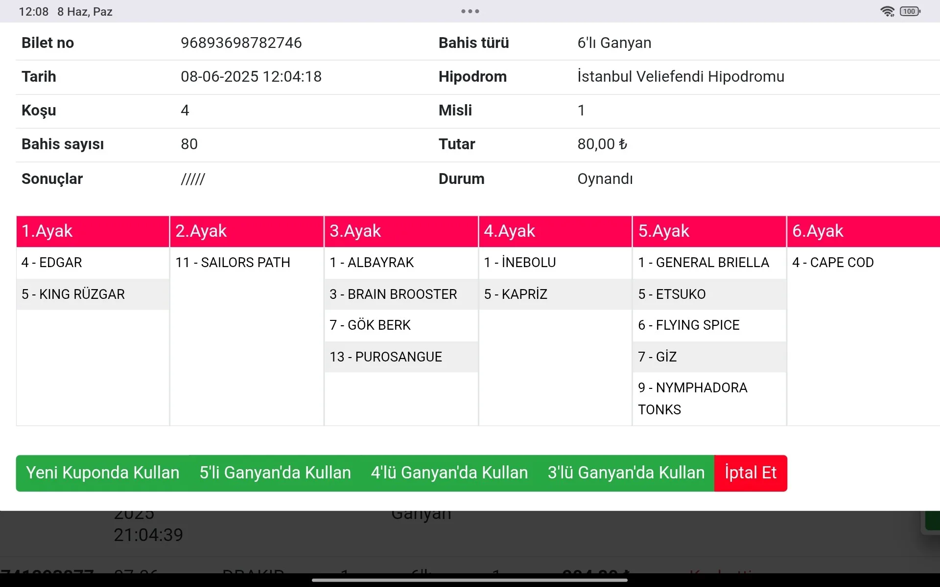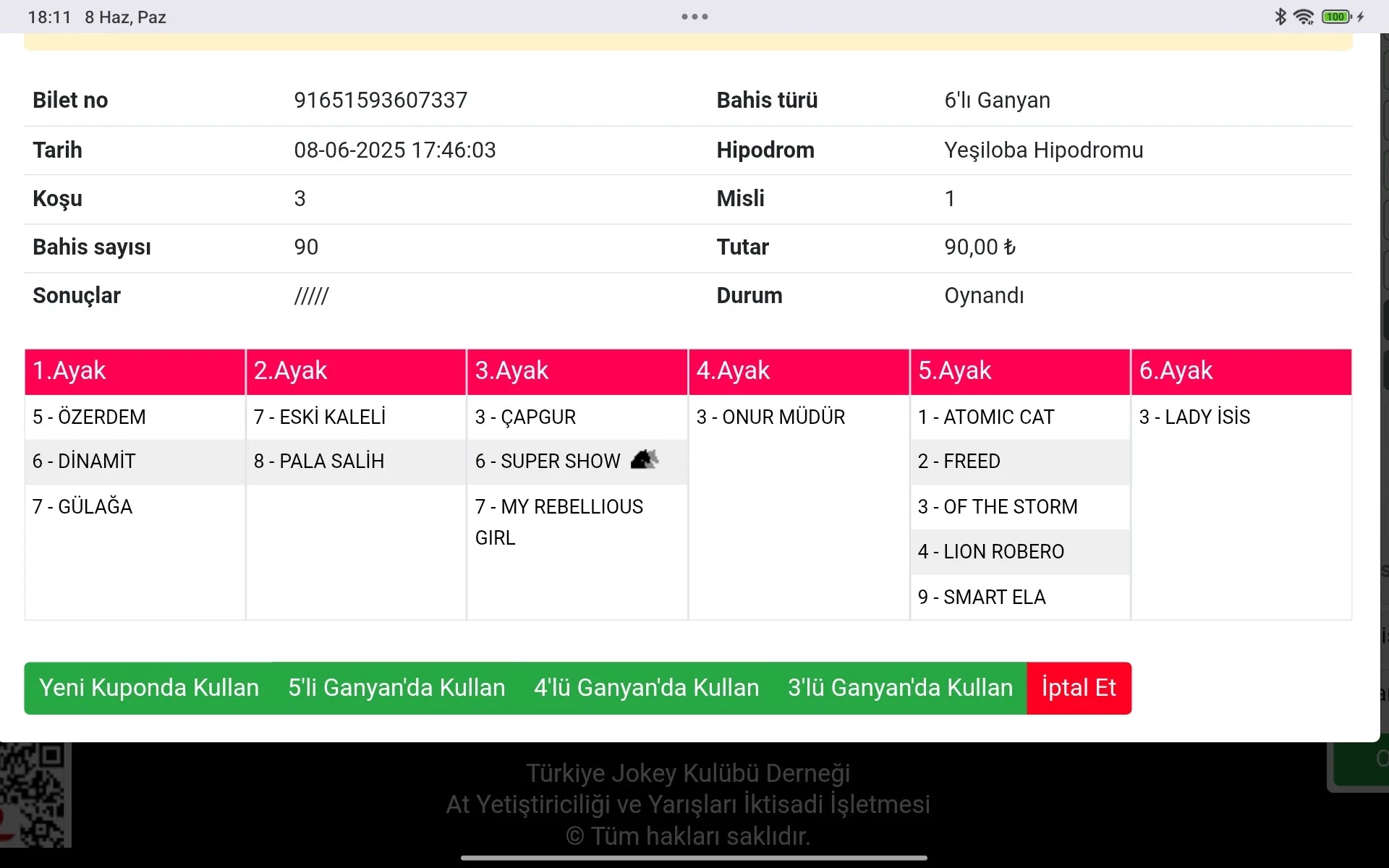 Bilet no 66900678886032 Bahis türü 5’li Ganyan