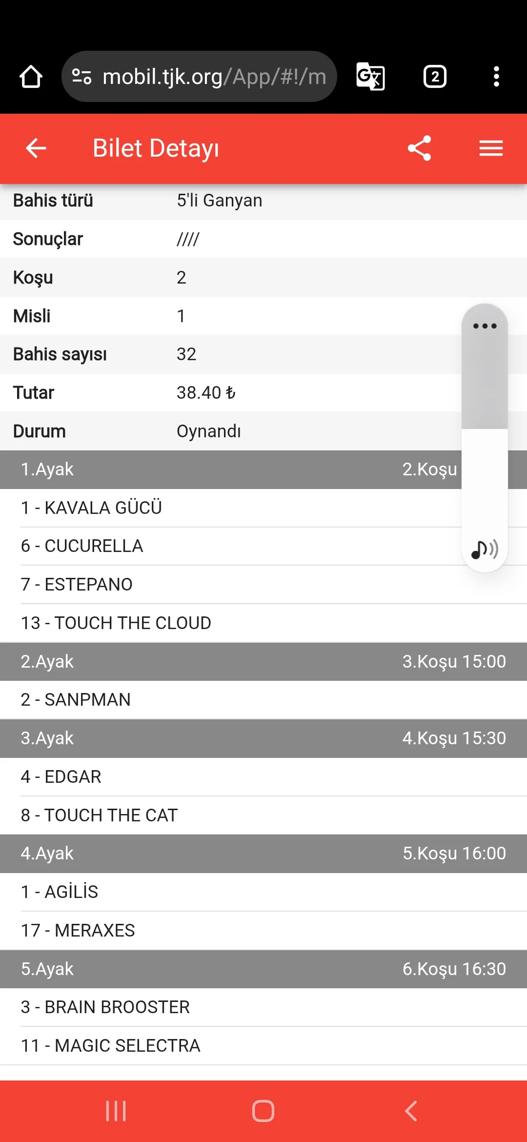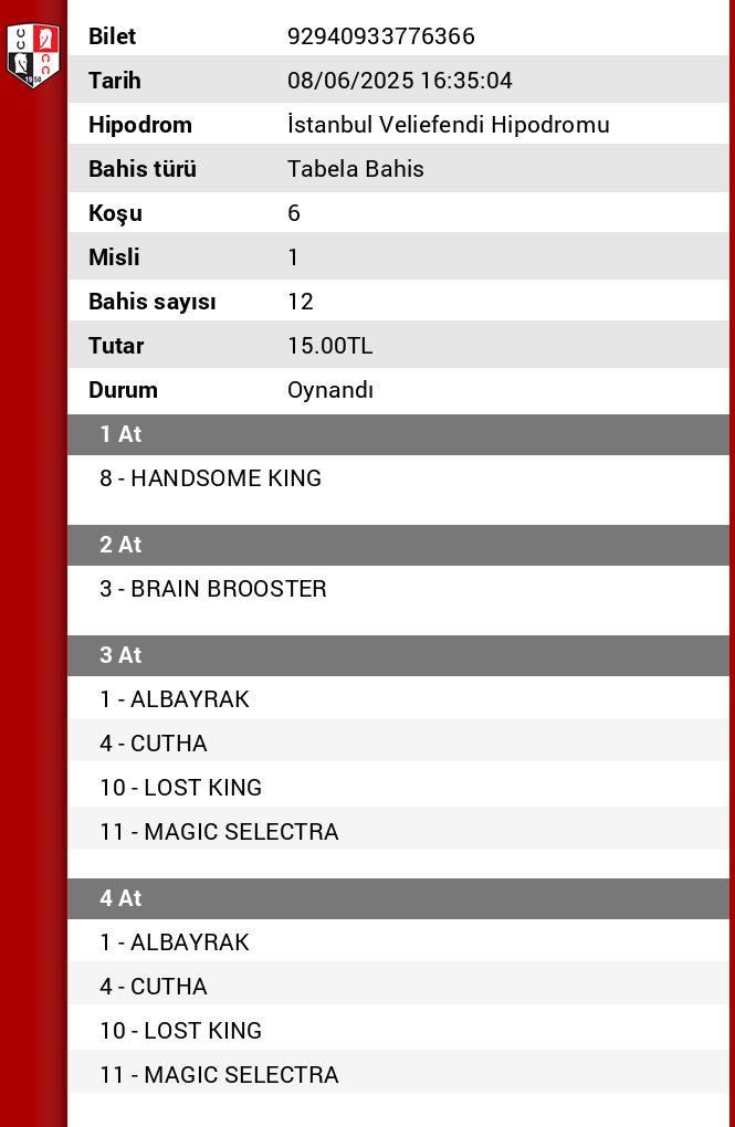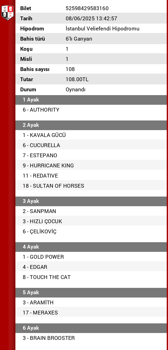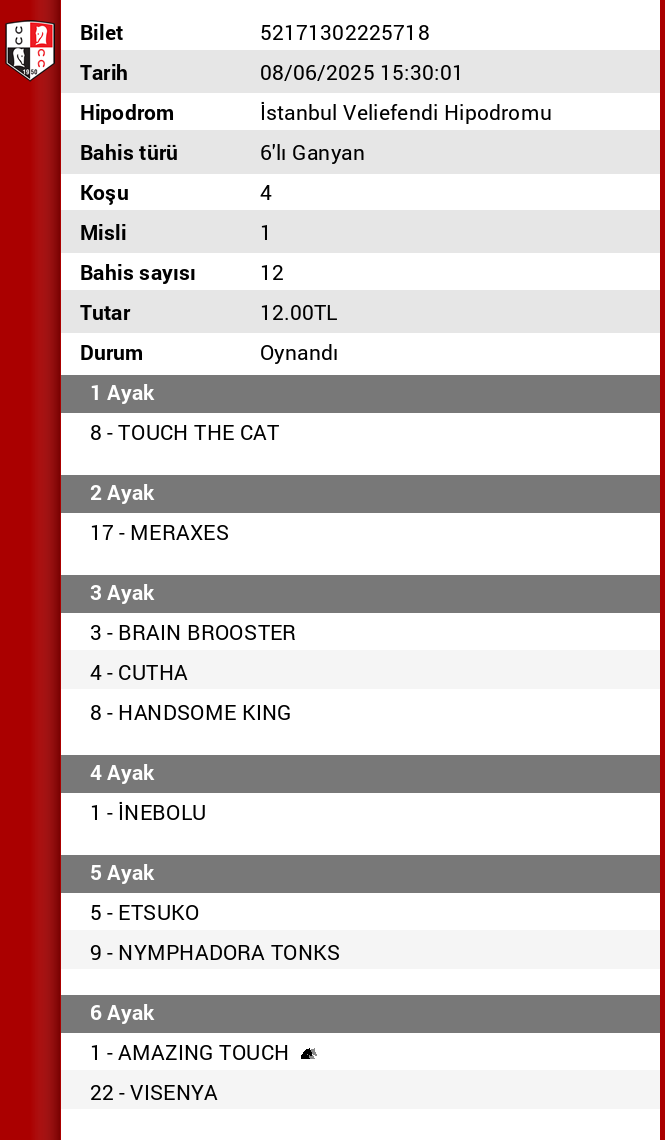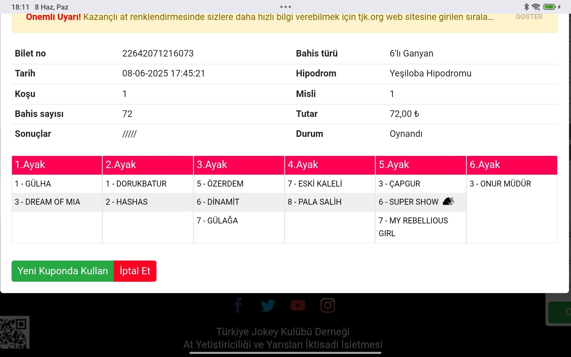 Bilet no 66900678886032 Bahis türü 5’li Ganyan