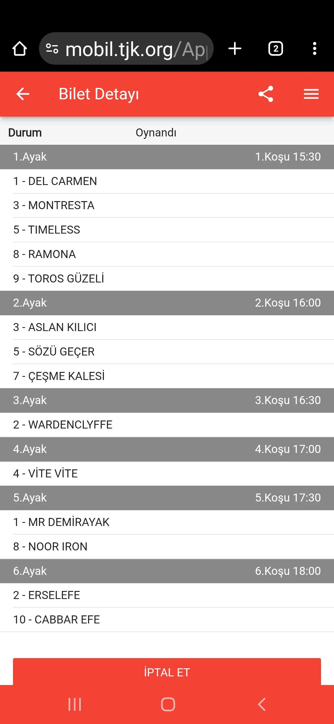 Naçizane öneri : Bence kuponlarinizi yatirmak icin cok acele ediyorsunuz, biraz daha ince eleyip sık dokuyun, en son haline getirin yaris baslamaya yakin netlestirin son halini ve oyle yatirin, boylece iptal etmek zorunda da kalmazsiniz. Hem yaris baslayana kadar cok sey degisebiliyor kurgunuzu etkileyecek. Cikan at, degisen jokey, degisen pist vb. (Tabi sayfa açmadığiniz zamanlarda)