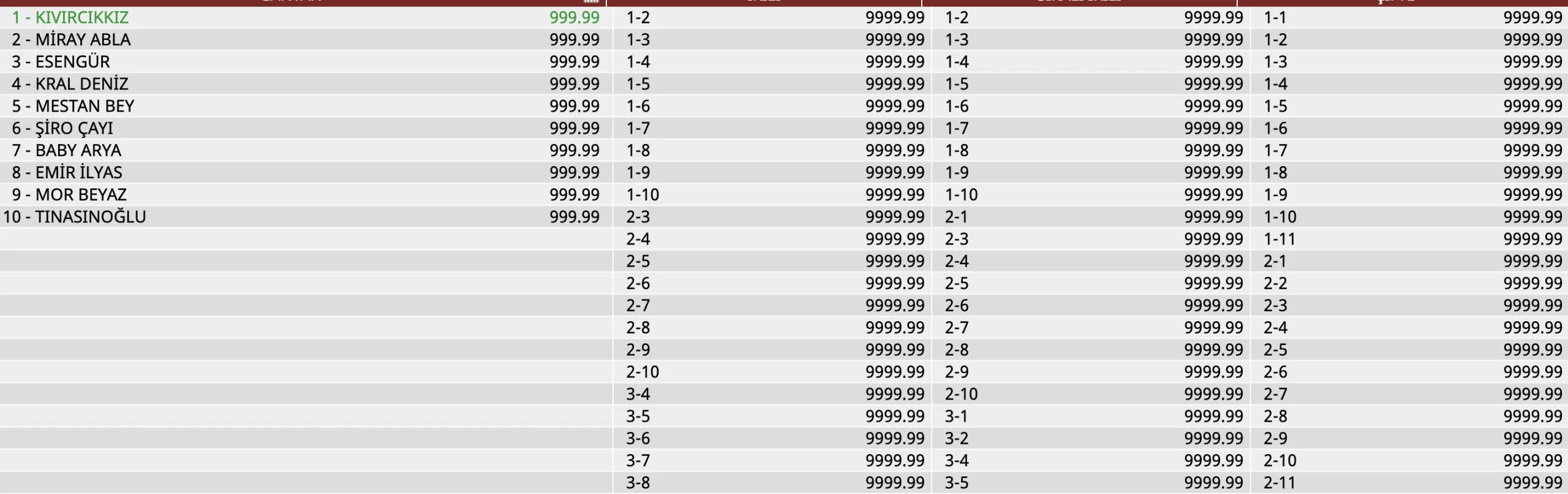 8.KOŞU: 6-THE ADMIRAL öne yazılır, 2-ESRARENGİZ uygun kilosuyla önde, 5-ZAGANOS yazılmalı, 1-BELLA MARE sağlama almak adına eklenmeli, 8-TIZ A ROCKET sağlama almak adına eklenmeli, 3-MADRIGOR temkinli kuponlar için, 4-ALMANYALI KIZ plase atı ve 7-IMPASSABLE CASTLE sigorta amaçlı yazılabilir öne eğilimli. Bu koşuda isimler birbirine çok yakın. Yaymak isteyenlere HEPSİ öneririm. AGF: (6) THE ADMIRAL (%25)