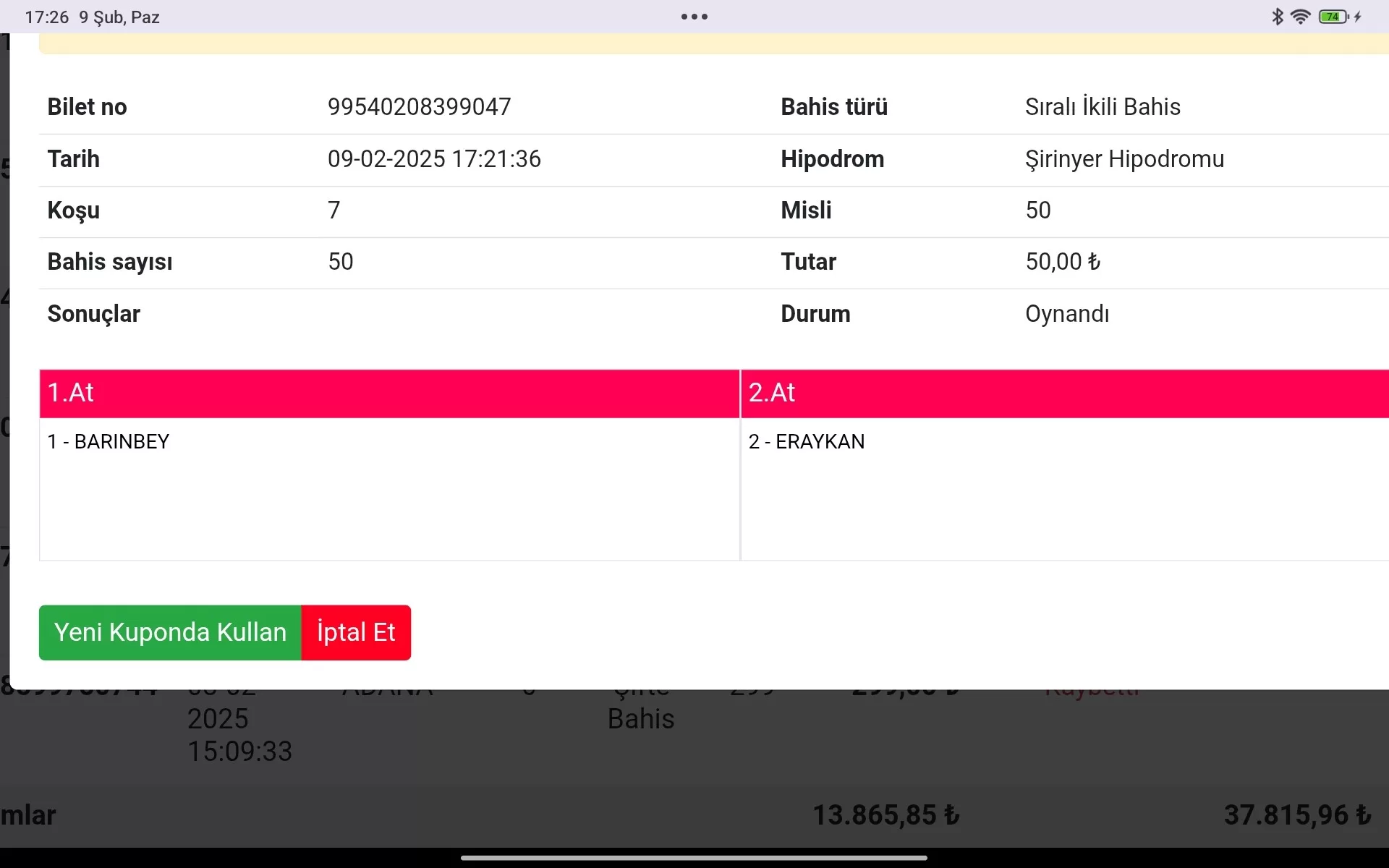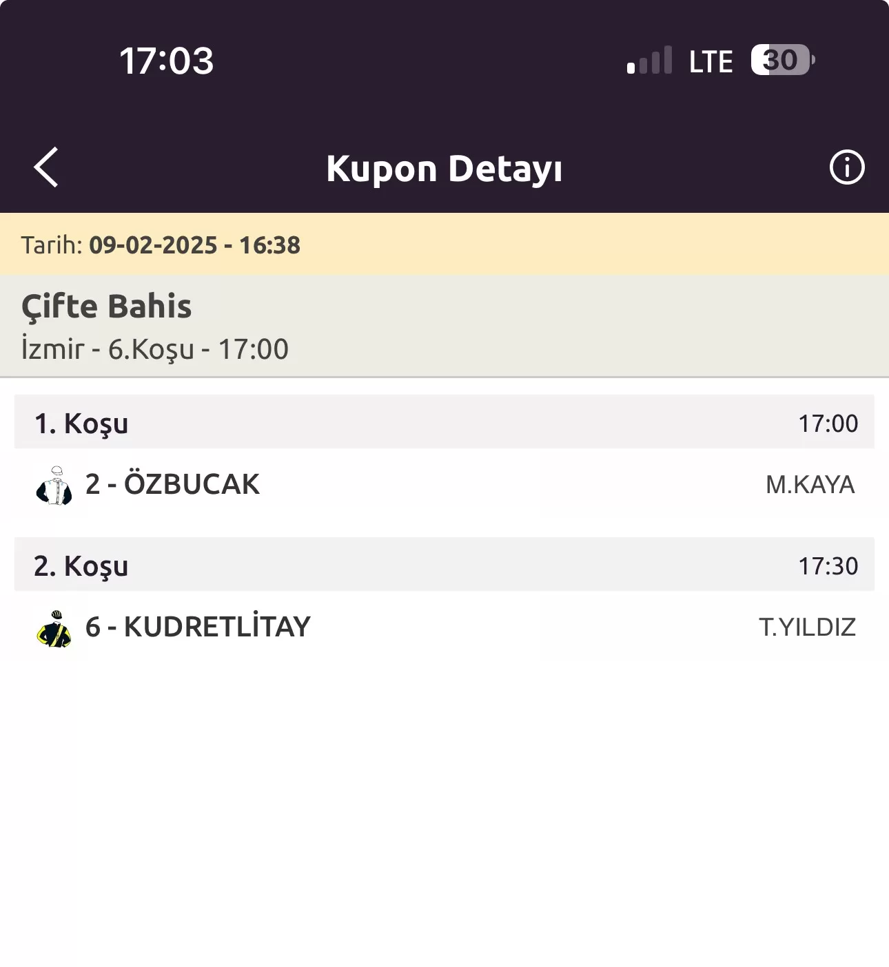 ADMİNİM evet haklısın bende jokeyler aprantilere istinaden böyle bir sıralı deneyeyim dedim M.KAYA,MER.ÇELİK T.YILDIZ N.AVCİ bunlardan bir cacık olmuyor