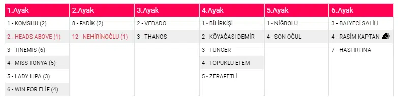Kocaeli 1.ayak.H. 2.ayak.9.GÜCLÜKAN. 3.ayak.2.VEDADO. 4.ayak.1.3.4. 5.ayak.1.4.5. 6.ayak.1.2.3.4.7.9. Tutar.40tl.